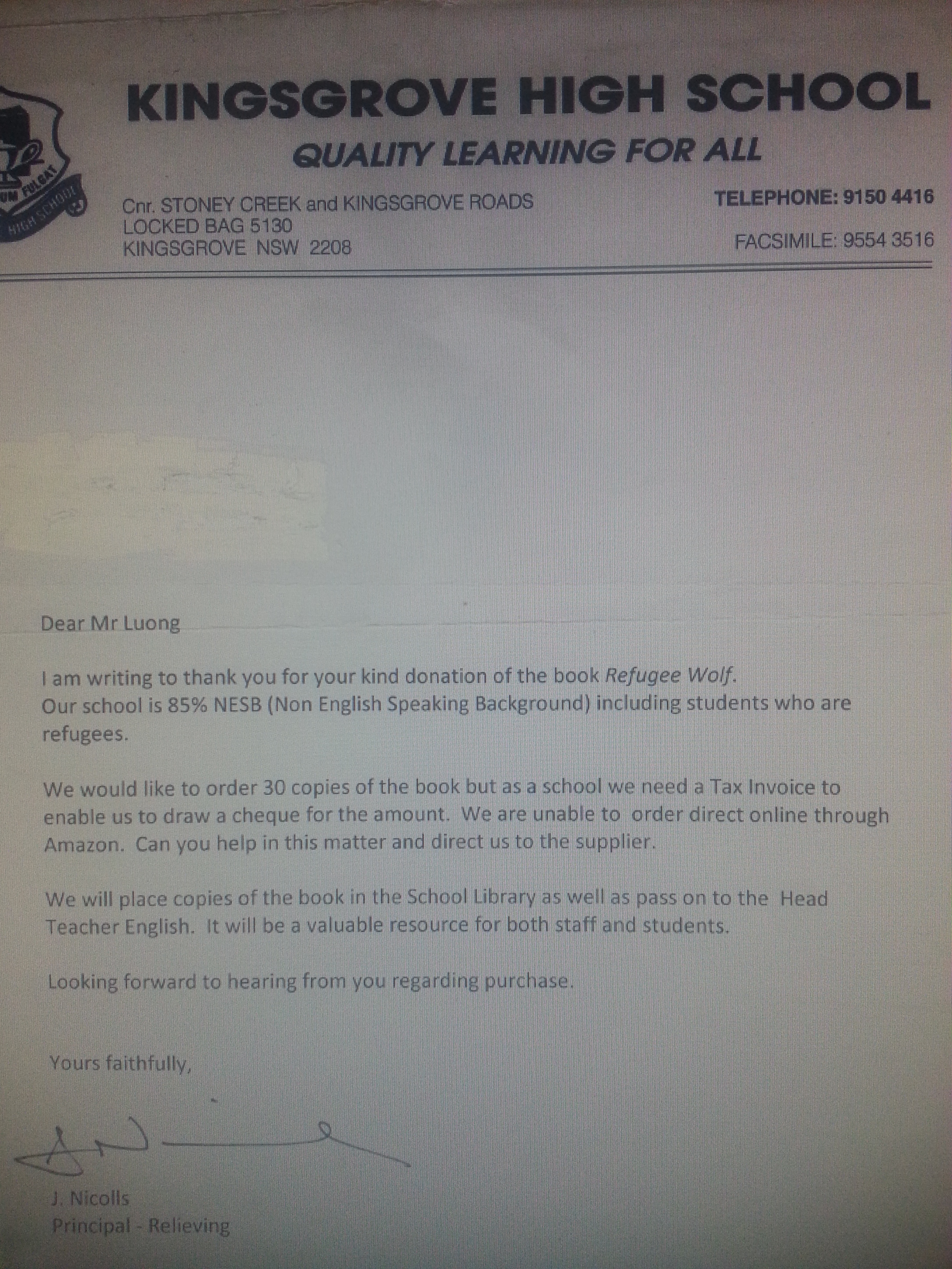 Home I forgot to mention that in July, Kingsgrove High School ordered copies of Refugee Wolf. They will add it their library as a teaching resource. I can’t thank them enough! Order for Refugee Wolf Share this: Click to share on X (Opens in new window) X Click to share on Facebook (Opens in new window) Facebook Like Loading... Related